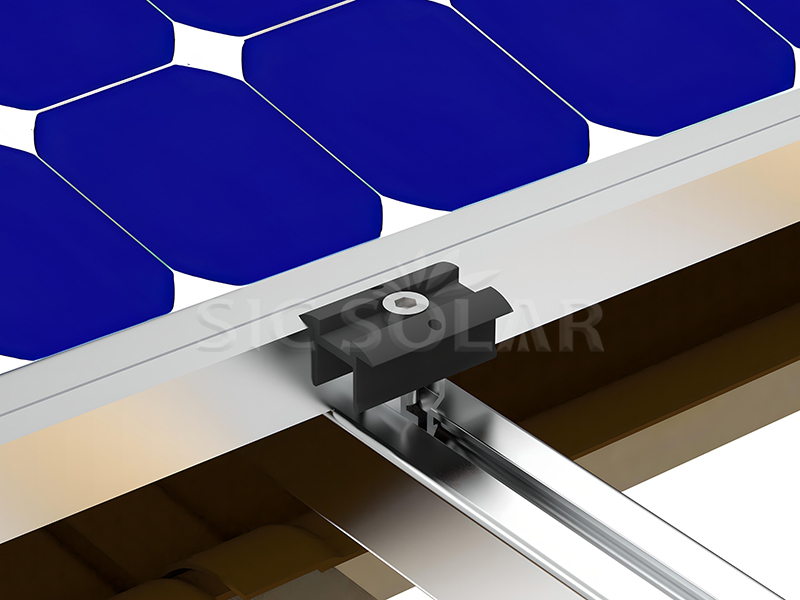 6️⃣ Solarpaneele anbringen: Befestigen Sie die Solarpaneele mit Mittel- und Endklemmen an den Schienen.