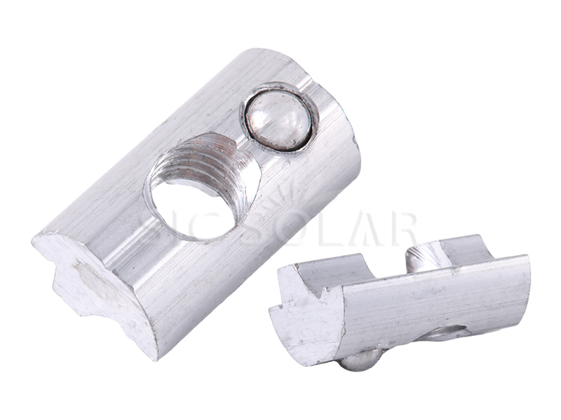 Gleitmutter mit A2-Kugel wird in die obere Nut von 40*40 Aluminiumprofilen geschwenkt, die zur Montage von Mittel- und Endklemmen für Photovoltaikmodule verwendet werden.
