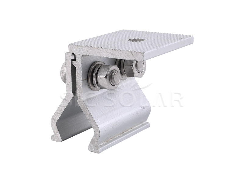 4️⃣ Montageschiene anbringen – Die Solarschiene oder -halterung mit Schrauben und Unterlegscheiben an der Oberseite der Nahtklemme befestigen.