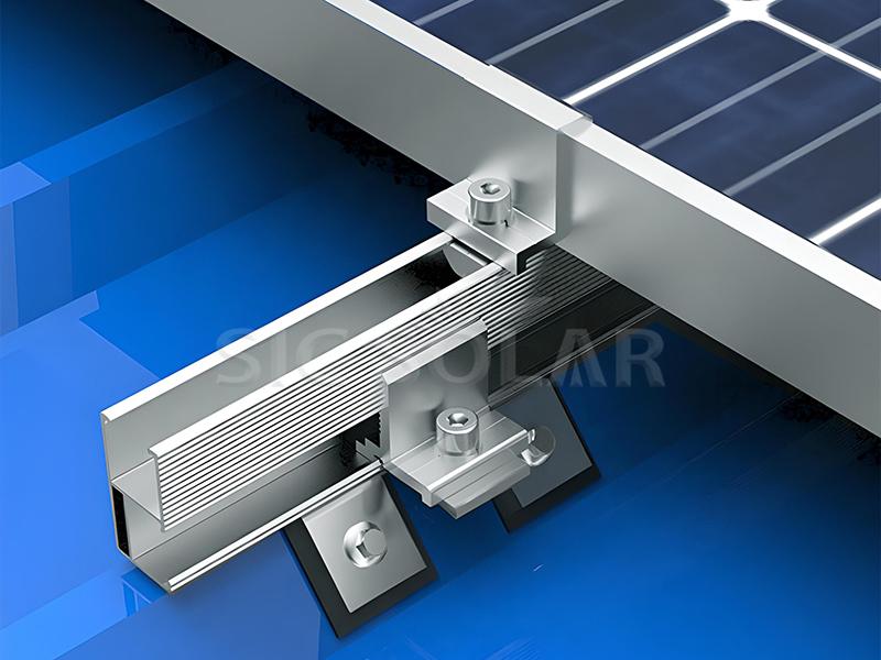 4️⃣ Montageschienen anbringen – Befestigen Sie die Aluminiumschienen mit Schrauben und Unterlegscheiben an den Klemmen und richten Sie sie aus, um eine genaue Positionierung der Paneele zu gewährleisten.